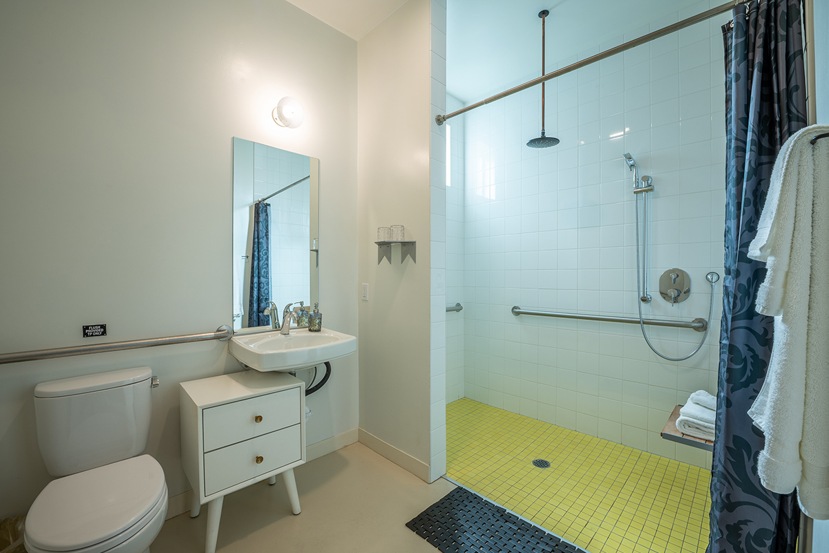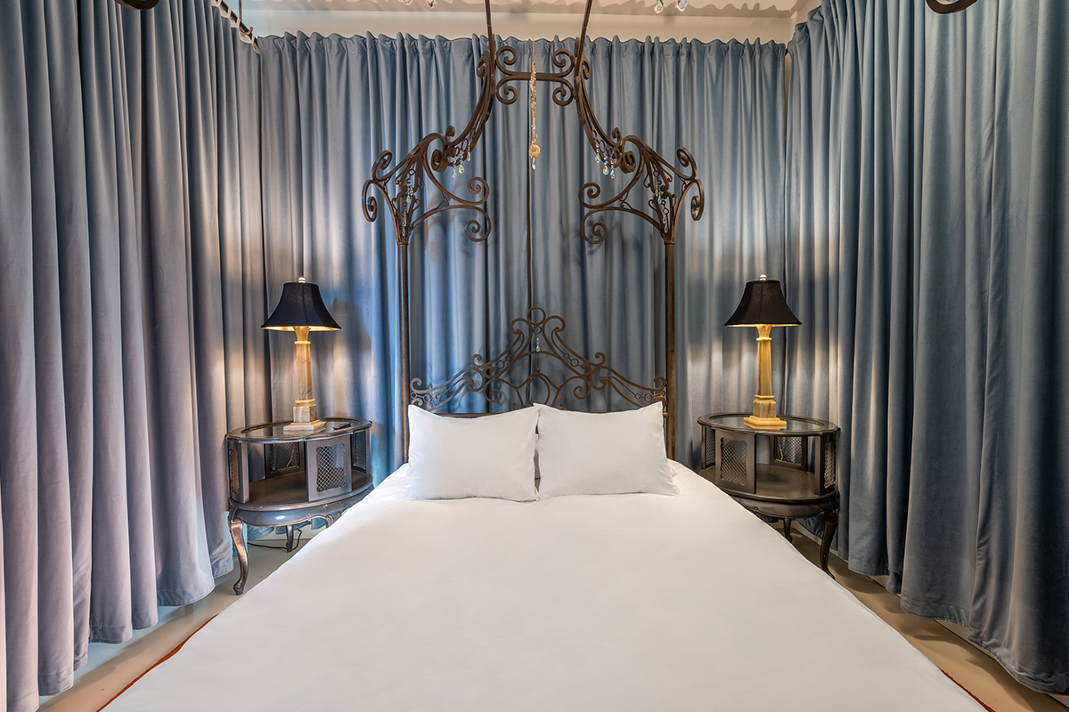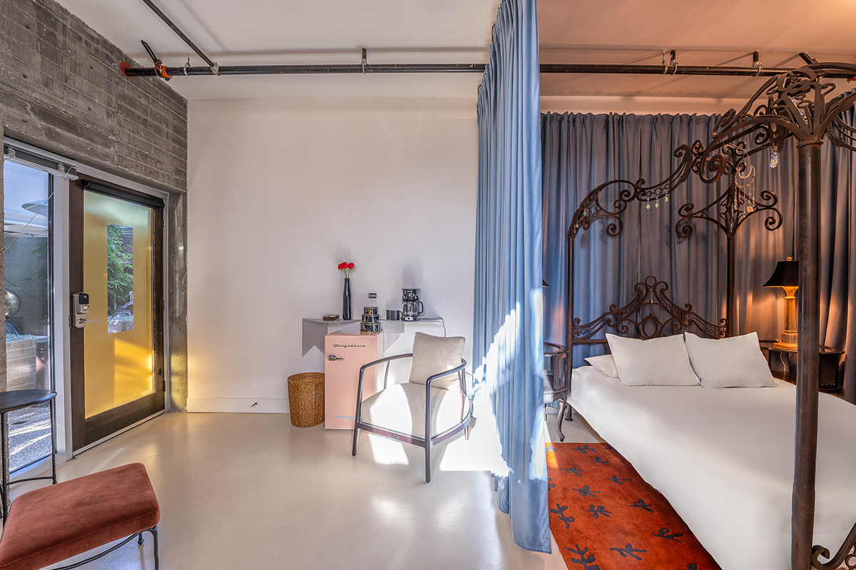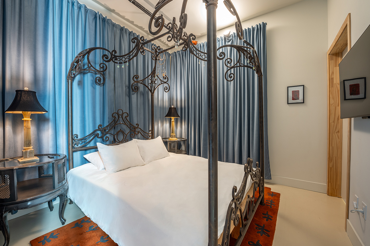 Room 2 is located on the first floor of our outdoor courtyard that is shared with our restaurant/bar, Alchemy | Choose Thy Poison, which is a lively environment with music and restaurant patrons that can last until 10 PM. Alchemy's tables and chairs where restaurant guests sit are directly in front of the entry door to Room 2. Room 2 has blinds and shades to completely privatize the room but this is something we note so guests are not surprised by the unique environment. Room 2 is not a good room for noise sensitive guests.